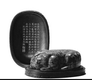 今年6月,在北京保利5周年春拍古董珍玩專場(chǎng)上,清乾隆“乾隆御用”御題詩(shī)澄泥伏虎硯及紫檀蓋盒以1400萬(wàn)元成交,打破硯臺(tái)拍賣世界紀(jì)錄。今年5月,在中國(guó)嘉德2010春拍“翦淞閣——文房清供”專場(chǎng)上,清康熙御制松花石龍馬硯以425.6萬(wàn)元高價(jià)成交,同樣引人注目。