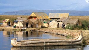 600多年前,為逃避西班牙和葡萄牙的殖民統(tǒng)治,烏魯斯族人來到蘆葦叢生的湖上,依湖而居,從此成為這里的主人。 起初的烏魯斯人,用蘆葦、蒲草編成厚實的蘆席和蒲席,再編成草船,在船上生活。后來,他們把幾條、十幾條草船連在一起,成為更穩(wěn)定的住所,浮島就這樣出現(xiàn)了。隨后,他們又編出了精巧的房屋。現(xiàn)在,湖上的浮島有60多個,小的有籃球場那么大,大的竟設(shè)有郵局、小學(xué)等公共設(shè)施。 踏上秘魯?shù)牡目系母u,你會感覺天是那樣近。腳下松軟的蘆葦蒲,不時發(fā)出“吱吱”聲,訴說著在此繁衍生息幾百年的烏魯斯人的故事。湖面波光粼粼,穿著五顏六色民族服裝的土著,是島上最鮮活的景物。