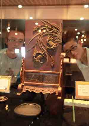 8月28日,為期9天的首屆文房四寶精品展在北京潘家園舊貨市場舉行,展出的200余件筆、墨、紙、硯和文房周邊用品中,既有收藏級別的歷代名品,也有當前市面上流通的文房精品。 圖為參觀者在首屆文房四寶精品展上欣賞硯臺。新華社發(fā)