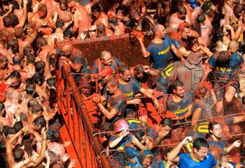 西班牙小鎮(zhèn)布尼奧爾8月25日迎來一年一度最重要的節(jié)日——西紅柿節(jié)。來自世界各地4萬多名游客歡聚在這里,相互投擲100多噸西紅柿,快樂上演了一場“西紅柿大戰(zhàn)”。 布尼奧爾位于西班牙東部巴倫西亞市以西40公里,人口約1萬。每到舉行“西紅柿節(jié)”時,這個平日里很安靜的小鎮(zhèn)就變得人聲鼎沸。游客不為美景、美食,只為“打仗”。 “西紅柿大戰(zhàn)”不僅為布尼奧爾帶來名氣,也帶來商機。節(jié)日期間,小鎮(zhèn)賓館爆滿,餐館、酒吧人滿為患,超市、商店顧客川流不息。街邊隨處可見賣泳鏡、一次性相機、紀念版T恤等物品的小攤位,因西紅柿汁會灼痛眼睛,損壞相機,更會將衣褲染色。為這短短一上午激烈“戰(zhàn)斗”,不光人要“裝備”,就連建筑物也需要。街坊鄰居早早用木板、塑料布將門窗等遮得嚴嚴實實,否則后果“不堪設(shè)想”。 “戰(zhàn)爭”還引來各國媒體爭相報道。當(dāng)局向從鎮(zhèn)政府陽臺及運送“武器”卡車上拍攝的攝影和攝像記者收取500歐元到2500歐元的“最佳位置拍攝費”。 很多游客迫不及待趕到鎮(zhèn)政府廣場。小伙子赤膊上陣,姑娘們身著比基尼。居住在臨街的人不時從陽臺潑出幾盆涼水,為將投入“戰(zhàn)斗”的人熱身。上午11時,爆竹騰空而起,“戰(zhàn)斗”號角吹響,廣場上一片沸騰,人們有節(jié)奏高喊“布尼奧爾”和“西紅柿”。 近10輛滿載西紅柿的卡車向小鎮(zhèn)中心廣場進發(fā),一路上向參加戰(zhàn)斗的人運送“彈藥”。大量被碾碎的西紅柿從卡車尾部傾瀉而出,每輛卡車上20多名工作人員從車廂內(nèi)抓起“彈藥”,奮力向人群拋,車下手持西紅柿者紛紛回擊。守候在樓頂上的人則拿起水龍頭,居高臨下攻擊街上本已亂作一團的人群。 大家手抓“西紅柿”,見人就打,不分敵我,連運送“武器”的卡車司機也無辜遭殃。無數(shù)西紅柿在頭頂飛舞、落下。為躲避來自四面八方的襲擊,大家左躲右閃,“中彈”只是遲早的事情。稍不留意,便有人從地上捧起一把西紅柿漿向旁邊人淋頭澆下。 戰(zhàn)斗結(jié)束時,地面上積攢了厚厚一層西紅柿汁,意猶未盡的戰(zhàn)士們開始撲倒在地。有人擺出仰泳姿勢,周圍的人立刻往他身上堆積西紅柿汁,直到僅剩一張臉露在外面。 最后,人們走上街頭與環(huán)衛(wèi)工人一起用掃把、高壓水槍清掃街道、墻面,水槍還會不時對準人群“掃射”,大家再次興奮起來。很快在腳下匯成一條條“西紅柿小溪”,湍急的“溪流”朝小鎮(zhèn)四周低處流去。 小鎮(zhèn)很快恢復(fù)了往日的潔凈,看不見西紅柿痕跡,如同剛下過一場雨。此時,街邊塑料紙和木板也被陸續(xù)撤走,露出小鎮(zhèn)原來的面容。 “西紅柿節(jié)”起源于1945年8月最后一個周三。當(dāng)時,小鎮(zhèn)舉行游行活動,一名年輕人在人群中被推倒,起身后順手拿起路邊菜攤上的西紅柿,砸向周圍的人,結(jié)果大家打成一團。次年,一群年輕人帶著西紅柿到廣場,又打了一場“西紅柿大戰(zhàn)”。此后,“西紅柿大戰(zhàn)”逐漸成為小鎮(zhèn)居民一場約定俗成的活動。 小鎮(zhèn)當(dāng)局一度禁止人們互相投擲西紅柿,但當(dāng)?shù)厝伺e行大規(guī)模游行示威,當(dāng)局終于在1957年同意將每年8月最后一個周三確定為“西紅柿節(jié)”,并由當(dāng)局提供西紅柿。2002年,西班牙政府將“西紅柿節(jié)”列入具有國際旅游價值的節(jié)日。