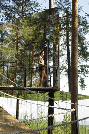 樹上酒店,顧名思義,建在樹上。6個房間的設(shè)計來自瑞典5家建筑企業(yè),面積15平方米至30平方米不等,內(nèi)部結(jié)構(gòu)大同小異,都有一個小廚房、一個陽臺和用作臥室、客廳的空間。盥洗室較多使用環(huán)保設(shè)計。 另外,一些房間帶有桑拿室和會議室。 各房間外表迥異,一些屬超現(xiàn)代風(fēng)格,一些走返璞歸真路線!傍B巢”設(shè)計靈感來自北京鳥巢,但外表像是鑲嵌在樹林中的一朵浮云,外表面使用一些織物。 “鏡立方”高4米、寬4米,墻壁全是鏡面玻璃。 “帶風(fēng)景的房間”則有一面墻全是玻璃窗,林中風(fēng)景一覽無余。