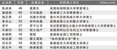 “榮譽(yù)博士”),占比42%。 42人當(dāng)中,頭頂博士帽的有近10人。不過(guò),這10人當(dāng)中,除朱共山等花錢(qián)抄近道修得的海外博士,以及如魯冠球等后來(lái)獲得的榮譽(yù)博士之外,按部就班、不打折扣的博士學(xué)位獲得者鳳毛麟角,尚德太陽(yáng)能的掌門(mén)人施正榮便是其中之一。 施正榮兩年前曾被通用電氣高管羅琳·波爾森稱(chēng)為是“10年后超過(guò)比爾·蓋茨的全球巨富熱門(mén)人物”,從長(zhǎng)春理工大學(xué)本科畢業(yè),到赴中科院上海光學(xué)精密機(jī)械研究所念碩士,再到澳大利亞新南威爾士大學(xué)獲得博士學(xué)位之后,他才開(kāi)始參加工作,在澳大利亞奮戰(zhàn)了8年,然后于2000年回國(guó)創(chuàng)業(yè),成立無(wú)錫尚德。從嚴(yán)格意義上來(lái)說(shuō),他是學(xué)者創(chuàng)業(yè)型的富豪和企業(yè)家,對(duì)習(xí)慣了“野蠻生長(zhǎng)”的中國(guó)企業(yè)家們來(lái)說(shuō),這種路徑顯然是不可復(fù)制的。 不同于張朝陽(yáng)和施正榮這種海歸博士,張文中等民營(yíng)企業(yè)家則是在國(guó)內(nèi)高校拿到的博士學(xué)位。張文中是物美控股集團(tuán)前董事長(zhǎng),1962年生于山東,本科和研究生都是在南開(kāi)大學(xué)讀的,25歲取得碩士學(xué)位后被分配到國(guó)務(wù)院發(fā)展研究中心,五年后,他在擔(dān)任世界銀行和國(guó)家“863”科技基金支持的一研究課題組長(zhǎng)中表現(xiàn)突出,受到部委領(lǐng)導(dǎo)好評(píng),不久后他于中國(guó)科學(xué)院獲得系統(tǒng)工程學(xué)博士學(xué)位;1994年他在北京創(chuàng)建物美商城。 張文中2006年身陷囹圄,兩年后一審被判有期徒刑18年。引人關(guān)注的是,接替張文中任物美董事長(zhǎng)的他的創(chuàng)業(yè)伙伴吳堅(jiān)忠,亦有中科院系統(tǒng)工程學(xué)博士學(xué)位。更有趣的是,張文中的簡(jiǎn)歷中稱(chēng)曾到美國(guó)斯坦福大學(xué)做博士后研究,而吳堅(jiān)忠曾在美國(guó)密歇根大學(xué)進(jìn)行博士后研究工作,且與張文中時(shí)間段相同,真可謂“黃金搭檔”。 企業(yè)家在國(guó)內(nèi)高校讀博,常見(jiàn)的一種情形是該校原本就是其母;蛳嗷ブg有著緊密聯(lián)系。近兩年飽受爭(zhēng)議的中國(guó)最大民營(yíng)擔(dān)保公司中科智集團(tuán)董事長(zhǎng)張鍇雍屬第一種情形,他是深圳市政協(xié)委員,1982年從中南礦冶學(xué)院(后并入中南大學(xué))金屬材料系本科畢業(yè)時(shí),他沒(méi)有想到自己最后在金融行業(yè)嶄露頭角,中南大學(xué)校友會(huì)的網(wǎng)站上稱(chēng)張鍇雍后來(lái)“先后攻讀了經(jīng)濟(jì)學(xué)和國(guó)際金融學(xué)兩門(mén)博士學(xué)位的全套課程”,而中科智的官方網(wǎng)站上直接稱(chēng)其獲得的是“金融工程學(xué)博士”。 國(guó)內(nèi)最大民營(yíng)鋼企之一的河北建龍集團(tuán)董事長(zhǎng)、曾被稱(chēng)為“鋼鐵首富”的張志祥屬后一種情形。他1989年畢業(yè)于浙江工業(yè)大學(xué)工業(yè)自動(dòng)化專(zhuān)業(yè),1994年開(kāi)始創(chuàng)業(yè),2000年時(shí)已聲名鵲起,之后除其母校外,他還與北京科技大學(xué)、東北大學(xué)合作頻繁,獎(jiǎng)學(xué)金是一種合作基本形式。他同時(shí)與北京科技大學(xué)聯(lián)合成立了“特殊鋼技術(shù)聯(lián)合聯(lián)發(fā)中心”,并任東北大學(xué)校董會(huì)常務(wù)董事——搞校企聯(lián)合,推進(jìn)建龍?jiān)跂|北的鋼鐵版圖。 2006年張志祥在接受一家媒體采訪時(shí)稱(chēng)自己在東北大學(xué)讀冶金專(zhuān)業(yè)的博士,目前尚不清楚他是否拿到了博士學(xué)位。