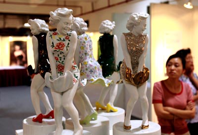 第十四屆上海藝術(shù)博覽會(huì)日前舉行開幕預(yù)展。此次藝博會(huì)的主題是“讓收藏成為風(fēng)尚”,匯聚了來自中國、德國、法國等14個(gè)國家的126家畫廊前來參展。在展出的作品中,不僅有羅丹、畢加索、達(dá)利、莫奈等世界藝術(shù)大師的原作,還有張大千、齊白石等收藏家夢(mèng)寐以求的中國大師的精彩畫卷,當(dāng)代藝術(shù)的名家陳逸飛、羅中立、陳丹青等的佳作也紛紛登場(chǎng)。全場(chǎng)約有6000余件油畫、國畫、版畫、雕塑、水彩、攝影、裝置、陶瓷等作品供藝術(shù)品收藏者選購。圖為觀眾在欣賞陶瓷雕塑作品《夢(mèng)露的中國夢(mèng)》。