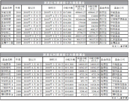 值得注意的是,9月以來,華夏基金分紅勢頭較猛。天相數(shù)據(jù)統(tǒng)計(jì)顯示,加上今日宣布分紅的2只債券基金,9月以來華夏基金旗下已經(jīng)有6只基金分紅,且分紅手筆較大。9月7日,華夏紅利和華夏成長雙雙分紅,每10份基金份額分別派發(fā)紅利4.9元和3.2元,分配總額分別達(dá)到49.02億元和26.04億元;9月9日,華夏藍(lán)籌每10份基金份額派發(fā)紅利3.4元,派發(fā)總額達(dá)到40.76億元;9月13日,華夏優(yōu)增每10份基金份額派發(fā)紅利7元,派發(fā)總額達(dá)到49.96億元。