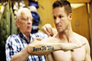 40歲的奧地利人菲利克斯-鮑加特納看上去更像個(gè)加利福尼亞州20歲出頭的小伙子,一身潮人打扮:時(shí)尚跑鞋、設(shè)計(jì)師牛仔褲、一件緊身黑T恤恰好露出他前臂上的青色文身——“為飛行而生”。