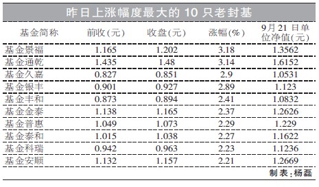 昨日,上證指數(shù)和滬深300指數(shù)的上漲幅度分別為1.41%和1.66%,在26只老封閉式基金中僅1只基金的上漲幅度低于上證指數(shù)的漲幅,僅4只基金的上漲幅度低于滬深300指數(shù)的漲幅。
