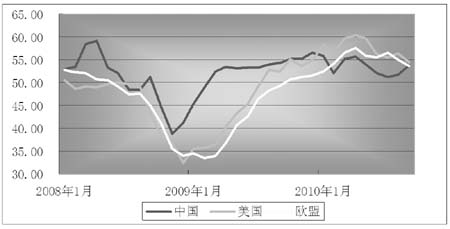 圖1:2008年1月-2010年9月主要經(jīng)濟體PMI指數(shù)走勢圖