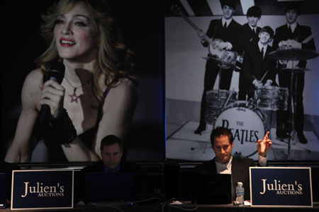 日前,朱利安拍賣行在澳門十六浦度假村酒店舉行好萊塢《傳奇》巨星拍賣會(huì),共拍賣434件好萊塢巨星名人的珍品,包括“華人之光”李小龍?jiān)陔娪啊端劳鲇螒颉分兴┲男印⑦~克爾·杰克遜多套華麗舞臺(tái)服飾等。新華社發(fā)