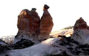 卡帕多奇亞最大的特點就是眾多聳立在平地上形狀奇特的小山峰,其外觀如石筍、似煙囪,不一而足,蔚為奇觀。它們是由數(shù)百萬年前三座火山噴發(fā)后散落的灰燼凝結(jié),再經(jīng)歷數(shù)千年風化和湖河雨水沖刷逐漸形成。