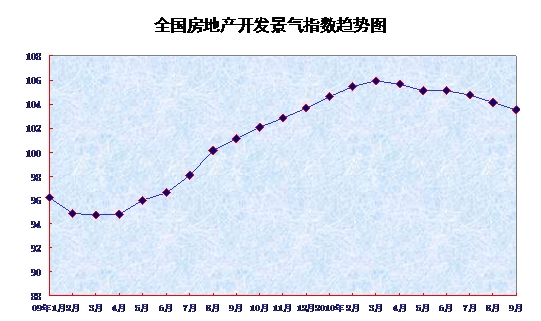9月份,全國(guó)房地產(chǎn)開(kāi)發(fā)景氣指數(shù)(簡(jiǎn)稱(chēng)“國(guó)房景氣指數(shù)”)為103.52,比8月份回落0.59點(diǎn),比去年同期提高2.44點(diǎn)。
