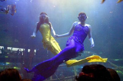 游泳愛好者的最佳職業(yè)!拉斯韋加斯的希爾威登酒店,昔日的游泳金牌得主希瑟-卡拉斯科與同事一起在一個巨大的水族館里穿著美人魚服裝嬉戲,以取悅客人。