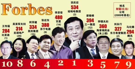 新榜單中的400人,提供了許多關(guān)于中國持續(xù)的經(jīng)濟(jì)繁榮和過去一年中財富膨脹的新觀點。在服務(wù)消費者的行業(yè)中的企業(yè)家繼續(xù)領(lǐng)先。榜單首位的宗慶后是娃哈哈飲料生產(chǎn)商。自去年宗慶后解決了娃哈哈和達(dá)能的糾紛,娃哈哈的天空變得蔚藍(lán);ヂ(lián)網(wǎng)的興起,本土企業(yè)對市場的掌控已經(jīng)超過了外國競爭對手,今年榜單第二名——百度搜索引擎的創(chuàng)始人之一李彥宏就是最好的體現(xiàn)。