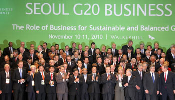 11月11日,出席首爾G20商務峰會的各國代表在會場合影留念。新華社發(fā) |