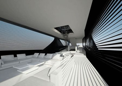 spa,全世界最高級的健身房,電影院當然也是必不可少的。Beluga的主甲板前面有一個14米長的游泳池,并且在兩個平行的休閑區(qū)還設(shè)有雞尾酒吧。車庫可以容納兩輛普通房車,在空置時可以很輕松的變成一家夜總會,舞池和高檔音響肯定是必備的。