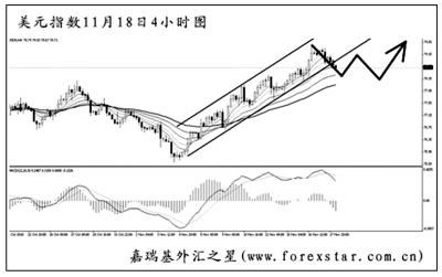 美元指數(shù)自低位反彈的力度強(qiáng)勁,已經(jīng)將日線圖道氏理論最后一個顯著高點(diǎn)78.35升破,同時,均線系統(tǒng)也被突破,中線的跌勢暫時告一段落。從圖上看,美元指數(shù)運(yùn)行在一個上升通道當(dāng)中,目前價(jià)格小幅跌破通道下沿,預(yù)計(jì)后市展開一小波下調(diào)的概率較大,但在4小時圖均線系統(tǒng)的依托下有望再度創(chuàng)出新高。