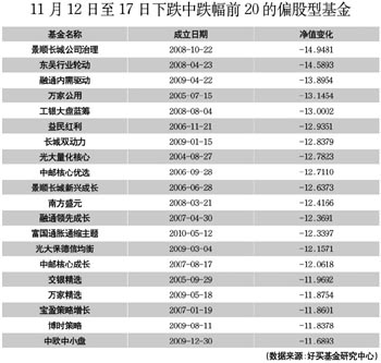 另?yè)?jù)天相投顧數(shù)據(jù)顯示,在大跌之前的11月11日,多數(shù)開(kāi)放式基金今年以來(lái)為投資者賺到了錢,虧損的主動(dòng)投資型基金僅有38只。而在經(jīng)歷了短短一周的暴跌后,虧損數(shù)量已擴(kuò)大至155只。117只基金重新踏上扭虧的道路,如果再算上被動(dòng)投資的指數(shù)型基金,虧損的偏股基金的數(shù)量更是高達(dá)202只,虧損基金在可比偏股基金中的占比已達(dá)約45%。