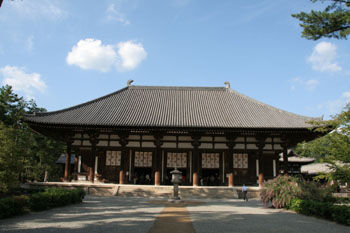 奈良最著名的大寺要屬東大寺,這里還是鑒真大師東渡后為圣武太上皇、光明太上皇后、孝謙天皇受戒之地。而東大寺最享有盛名的建筑要數(shù)大佛殿,殿內(nèi)的盧舍那佛像是日本最大的銅佛,高近15米。當年為給大佛鍍金共使用了約375公斤黃金和2110公斤水銀。不過,如今的大佛殿和大佛都是江戶時代重建的,大殿體積只相當于當年體積的2/3。盡管如此,在奈良西郊當年的皇宮正殿,也能夠清楚地看到東大寺大佛殿巨大的屋頂,大佛殿在近代以前一直是世界最高大的木造建筑物。