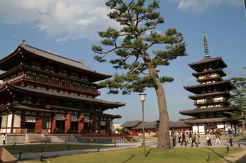 藥師寺的東塔聳立了1300年,西塔是1981年復建的。一座飽經(jīng)風霜,一座金碧輝煌,相映成趣。東塔實為三層,但是每層下面都有收縮的夾層,看起來是六層,富有節(jié)奏感,被譽為日本最美的塔。藥師寺金堂也是這種帶有夾層的結構,所以顯得格外優(yōu)美。從藥師寺西部稱為“大池”的湖泊遠眺,東塔和西塔高聳的一舊一新的塔剎,富有動感的塔身,金堂寬大雄偉的屋頂,金色的鴟尾——這富有動感的三座建筑組合在一起,巧奪天工,被稱為“凝固的樂章”,是很多攝影發(fā)燒友的最愛。