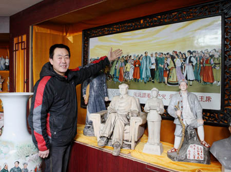 北京民間瓷雕收藏家張濤從上世紀(jì)90年代開始進(jìn)行瓷雕專項(xiàng)收藏,至今已有藏品近5000件,其中表現(xiàn)毛主席各歷史時(shí)期的形象的作品近千件。目前,張濤正在籌建瓷雕博物館,希望更多的人能欣賞到這項(xiàng)精湛的工藝美術(shù)形態(tài)。圖為民間收藏家張濤展示他收藏的毛主席瓷雕作品。