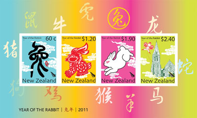 為慶祝辛卯兔年,新西蘭郵政局將于2011年1月12日正式發(fā)行兔年紀(jì)念郵票。這套兔年郵票包括一套4張面值為60分、1.2新西蘭元、1.9新元、2.4新元郵票以及小型張,首日封,郵戳和集郵套裝。兔年郵票由新西蘭華裔設(shè)計(jì)師李勃以及他的團(tuán)隊(duì)“勃亞傳播”設(shè)計(jì)。圖為將由新西蘭郵政局發(fā)行的兔年紀(jì)念郵票小型張。