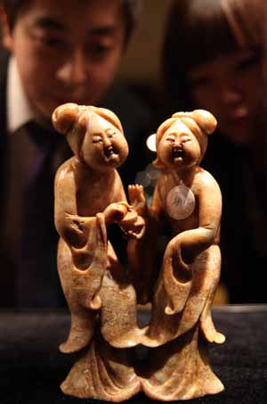 為期3天的“古玉雅集”古代玉器專場拍賣會預(yù)展日前在北京昆侖飯店舉行,展出468件各類古代玉器。正式拍賣將在1月9日舉行。圖為參觀者在“古玉雅集”古代玉器專場拍賣會預(yù)展上欣賞唐代白玉仕女?dāng)[件。新華社發(fā)