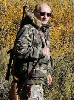 為促進俄羅斯的內(nèi)需,也為印證自己不僅有強壯胸膛還有時尚觸覺,普京穿上了一款迷彩大衣,配以獵槍、墨鏡等道具,深入到雪豹保護區(qū)進行外景拍攝。