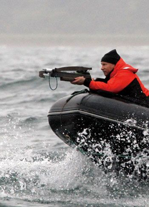 在堪察加半島海域飛馳的橡皮快艇上,普京趴在船頭射鯨,這是為了取得一小塊鯨魚皮膚用作科研。當射中后,普京相當興奮,對記者大喊:“我射了4次,終于射中了!倍霈F(xiàn)在中文媒體的標題則是:《普京射鯨》。還射了4次。