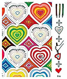 其中面值0.58歐元的郵票是自由上色郵票(圖1),主圖是5層心形,使用者可以根據(jù)自己的喜好給各層心形涂色,郵票左下的小圖案就是使用說明;面值0.95歐元的郵票上有一顆大紅心(圖2),這顆紅心是采用燙印技術(shù)印上的一層可以刮掉的膜,使用者可以用筆在上面刮劃出自己的名字或想說的簡(jiǎn)短話語(yǔ),左下小圖說明中紅心上的MG就是設(shè)計(jì)師姓名的縮寫。