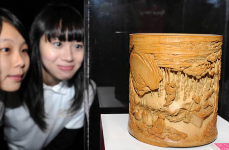 圖為洪建華現(xiàn)代竹雕作品《竹林七賢》筆筒復(fù)制品。原件2006年被北京故宮博物院永久收藏、為故宮自上世紀(jì)50年代以來(lái)收藏的第一件竹雕作品。