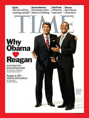 最新的177卷第5期的美國《時(shí)代周刊》雜志于2011年1月28日正式出刊,本期封面文章標(biāo)題為“里根:奧巴馬的榜樣”。文章認(rèn)為,里根與奧巴馬雖處在不同年代,分屬不同的政治陣營,但前者的政治智慧無疑或多或少在影響著后者的執(zhí)政思路。
