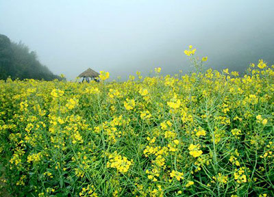 在海拔1000米的石灶天池上的石門國家森林公園里,有著被譽為廣東第一高山的油菜花海。上百畝的油菜花田,綿延了將近兩公里。微風(fēng)吹來,漫山遍野的金黃色如波浪翻涌,在茂密森林和天然河谷的映襯下,構(gòu)成一幅心曠神怡的田園風(fēng)光圖。今年公園更新設(shè)了獨特的“梯田油菜花”,站在頂端之上,一級級交錯的油菜花海就在腳下,仿如一本立體的燙金畫冊。