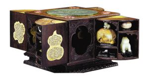多寶格的設計,琳瑯多樣,精巧無比,不論盒、匣、箱、柜,皆是一種妥善利用空間的工藝作品、以最有限的空間,存放最多的物品,在造型上,力求美觀精巧,所以往往一件多寶格,箱蓋中有盒、盒中有套匣、套匣中又有屜、隱隱約約、輾轉曲折,有時一個轉紐,便見門,門之后,另有一番天地。故多寶格體積雖小僅及尺許,而其所藏珍玩,每每多達數(shù)十,乃至百件,因此觀賞時常有尋尋覓覓、撲朔迷離的趣味。