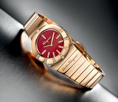 16格鉆石鑲嵌的刻度被點(diǎn)飾在表圈及菲拉格慕標(biāo)志性的紅色琺瑯表面上,純凈的光澤輝耀著整款腕表。