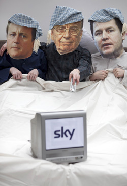 3月3日,抗議者在英國首都倫敦裝扮成英國首相卡梅倫(左)、新聞集團董事長默多克(中)和英國副首相克萊格,以此反對新聞集團收購天空電視臺。新華社/法新 |