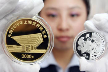 上海世博會第二組彩色金銀紀(jì)念幣。新華社發(fā)(陳代述/攝) |