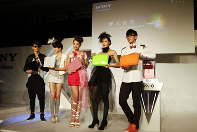 在上海舉行的以“智尚新界”為主題的索尼VAIO春季個人電腦新品發(fā)布會上,索尼集中發(fā)布了今年春季面向中國市場推出的5大系列多款VAIO筆記本電腦新品,其中包括其首款3D筆記本電腦。圖為模特在展示C系列新品筆記本電腦!