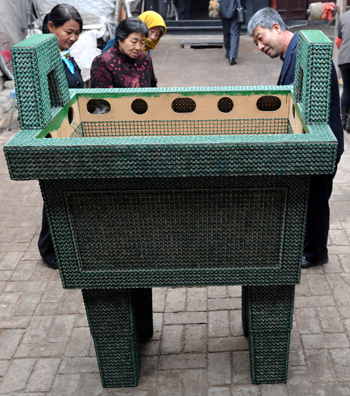 山西省左權(quán)縣72歲的收藏愛好者王艾甫用50余年收集來(lái)的古錢幣,制作成了一只高1.6米、寬1.2米的大鼎。這件名為“開元盛鼎”的作品由一萬(wàn)八千余枚形式相同的“開元通寶”銅幣組成,耗時(shí)5年方制作完工,正準(zhǔn)備申報(bào)吉尼斯世界紀(jì)錄。王艾甫說(shuō),他希望把“開元盛鼎”作為建黨90周年的獻(xiàn)禮,祝福祖國(guó)繁榮昌盛。圖為參觀者在觀看“開元盛鼎”作品。