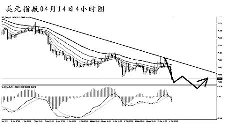 美元指數(shù)沿圖中的下降趨勢(shì)線步步走低,在跌破75.60的支撐之后,下方將考驗(yàn)2009年11月的低點(diǎn)74.15。短線空頭動(dòng)能有所減弱,但目前還沒(méi)有任何跡象表明美元指數(shù)即將見底。4小時(shí)圖道氏理論最后兩個(gè)顯著高點(diǎn)阻力在75.05和75.15,只有將這一帶阻力有效升破,后市才可期待較為明顯的反彈走勢(shì)發(fā)生。目前應(yīng)繼續(xù)對(duì)美元抱以看空的思路。