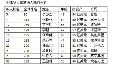 中國大陸地區(qū)首富為百度的李彥宏,他以94億美元的身家超過了前首富——娃哈哈的宗慶后(59億美元)。此外,三一重工的梁穩(wěn)根(80億美元)憑借去年三一重工股價的飆升,財富猛增122%,成為中國大陸第二富豪。宗慶后今年排在大陸富豪第三位。