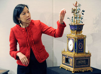 圖為傳媒預(yù)展上工作人員正在介紹清乾隆年間的鎏金銅鑲嵌琺瑯料石轉(zhuǎn)花花盆頂水法音樂鐘,估價1800萬至2500萬港元。