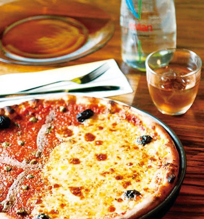 披薩一半是芝士味,另一半是銀魚柳配水瓜榴。先將面團拉成14寸的底后涂抹上番茄醬,然后再分開制作。芝士部分用的是法國芝士;另一半是銀魚柳配水瓜榴,全部餡料下好后,就放進披薩爐中烘烤。新鮮出爐的披薩搭配一杯餐前酒就更完美。