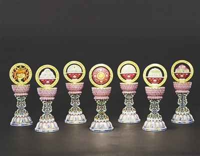 其實,早在2005年香港佳士得春拍中,曾經(jīng)就有一件類似的瓷質(zhì)供器以330萬港元成交。但國內(nèi)收藏圈尚沒有對于佛教供器產(chǎn)生興趣,也缺乏必要的認識和了解。所以,當(dāng)清乾隆粉彩盂蘭盆供器(七件)第二次出現(xiàn)在拍場時,并沒有拍賣公司對其進行事先的宣傳預(yù)熱,也沒有機會登上拍賣圖錄的封面,預(yù)展時更是被安排在了不很起眼的位置上……不料,它還是在眾多的器物中被大藏家選中,在拍賣場上一鳴驚人。