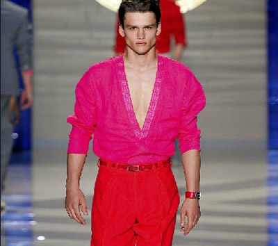 設(shè)計(jì)師Donatella Versace用柔軟的皮革面料來打造寬松及膝短褲與西裝,讓看似休閑感的廓型呈現(xiàn)出華麗,強(qiáng)硬的氣勢(shì),衣襟處、褲裝側(cè)面都加上了大量的金屬搭扣裝飾,來進(jìn)一步展現(xiàn)男性的剛強(qiáng)氣概。敞開穿著的寬松條紋長(zhǎng)袍、絲質(zhì)V領(lǐng)襯衫帶來了海灘度假感覺,同時(shí)也仍是硬朗派型男們展示身材的絕佳“武器”。