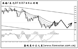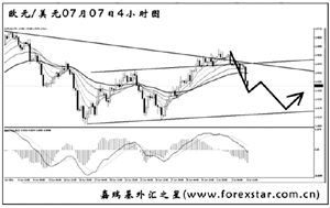 歐元兌美元此前的上漲刺破了日線圖形成的下降壓力線,但未能形成有效突破,短線匯價重新選擇下行,且力度強勁。圖中的震蕩通道為前一段時間形成,現(xiàn)在來看仍然起到一定的效果。預(yù)計歐元將首先向下挑戰(zhàn)通道下沿1.4140一線支撐,能否跌破成為后市繼續(xù)下跌的關(guān)鍵。
