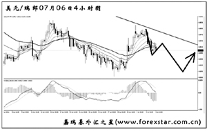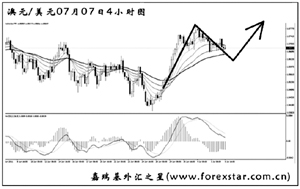 美元兌日元再一次對80.00的整數(shù)關(guān)卡挑戰(zhàn)失敗,目前短線震蕩上行,運行在一個平緩的通道之中。日線圖均線系統(tǒng)已經(jīng)被小幅升穿,壓制效果已不明顯。預(yù)計匯價再度大幅下跌的欲望并不強烈,目前以小倉做多為主思路,但止損要嚴(yán)格放在圖中的通道下沿下方。