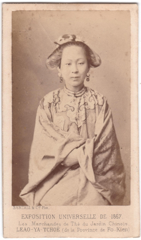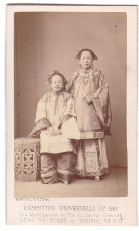由法國BERTALL照相館拍攝的“參加1867年世界博覽會的中國茶姑念亞彩(右),周雅妮(音)。包括該照片在內(nèi)的12張CDV照片,在2009年拍出了16萬元人民幣的價格。私人收藏(影易時代供圖)記者 張建/攝 |