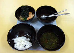 在沉默中,大家自取用來(lái)清潔餐具的清水、豌豆飯、腌菜湯和小菜。一切都有條不紊地按照順序進(jìn)行,連餐具的清潔都有特定步驟。小菜包括辣白菜、涼拌菠菜、沙參和豆腐,各取所需,量非常少。最重要的是,每個(gè)人必須拿一小塊酸蘿卜。大家沉默地吃完,再倒上鍋巴湯,用酸蘿卜塊仔細(xì)擦拭干凈每個(gè)碗,將其連湯帶水全部吃完,最后用手巾一一擦干,重新套好歸位。從吃飯到洗碗,一次全部完成,真是綠色、節(jié)儉又高效。缽盂供養(yǎng)教給大家不浪費(fèi)、自力更生的道理,是修行中不可或缺的一部分。