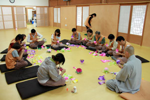 用餐后,大家進(jìn)行簡(jiǎn)單勞動(dòng)(洗碗、清掃等),步行親近自然、學(xué)習(xí)做蓮燈等活動(dòng)。專心從事著簡(jiǎn)單的肢體勞動(dòng),腦中的雜念仿佛都消失了。