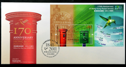 8月25日,香港郵政發(fā)行“香港郵政服務170周年”的郵票小型張及相關集郵品。據(jù)悉,這套紀念郵票小型張的左側呈現(xiàn)1911年落成的舊郵政總局和自1976年啟用至今的郵政總局的外貌,與維多利亞女王時期,即1837年至1901年間鑄造的圓柱形郵筒和現(xiàn)今采用的新款郵箱相呼應,展現(xiàn)時代對比。 圖為貼有“香港郵政服務170周年”郵票小型張的已蓋銷首日封。