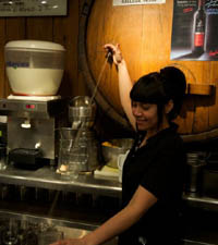 女招待身后那個巨大的橡木桶,里面盛著蘋果酒,蘋果酒并不像葡萄酒那樣會緩緩流出。由于酒桶內(nèi)的壓強較大,蘋果酒都是噴出來的,因此這要求招待一定要用杯子很準的接在酒噴射到的地方。